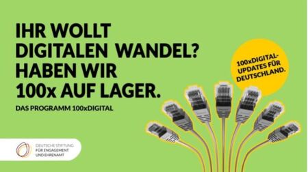 Mit der Fördermaßnahme 100xDigital unterstützt die Deutsche Stiftung für Engagement und Ehrenamt deutschlandweit 100 gemeinnützige Organisationen aus unterschiedlichen Engagement-Feldern beim digitalen Wandel.
